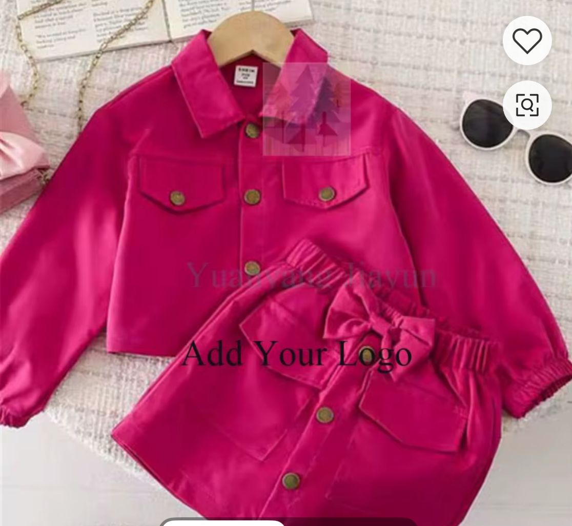 Il s’agit d’un ensemble de couleur rose, avec une veste à col et des boutons dorés, et une jupe assortie avec une ceinture élastique et un nœud décoratif.